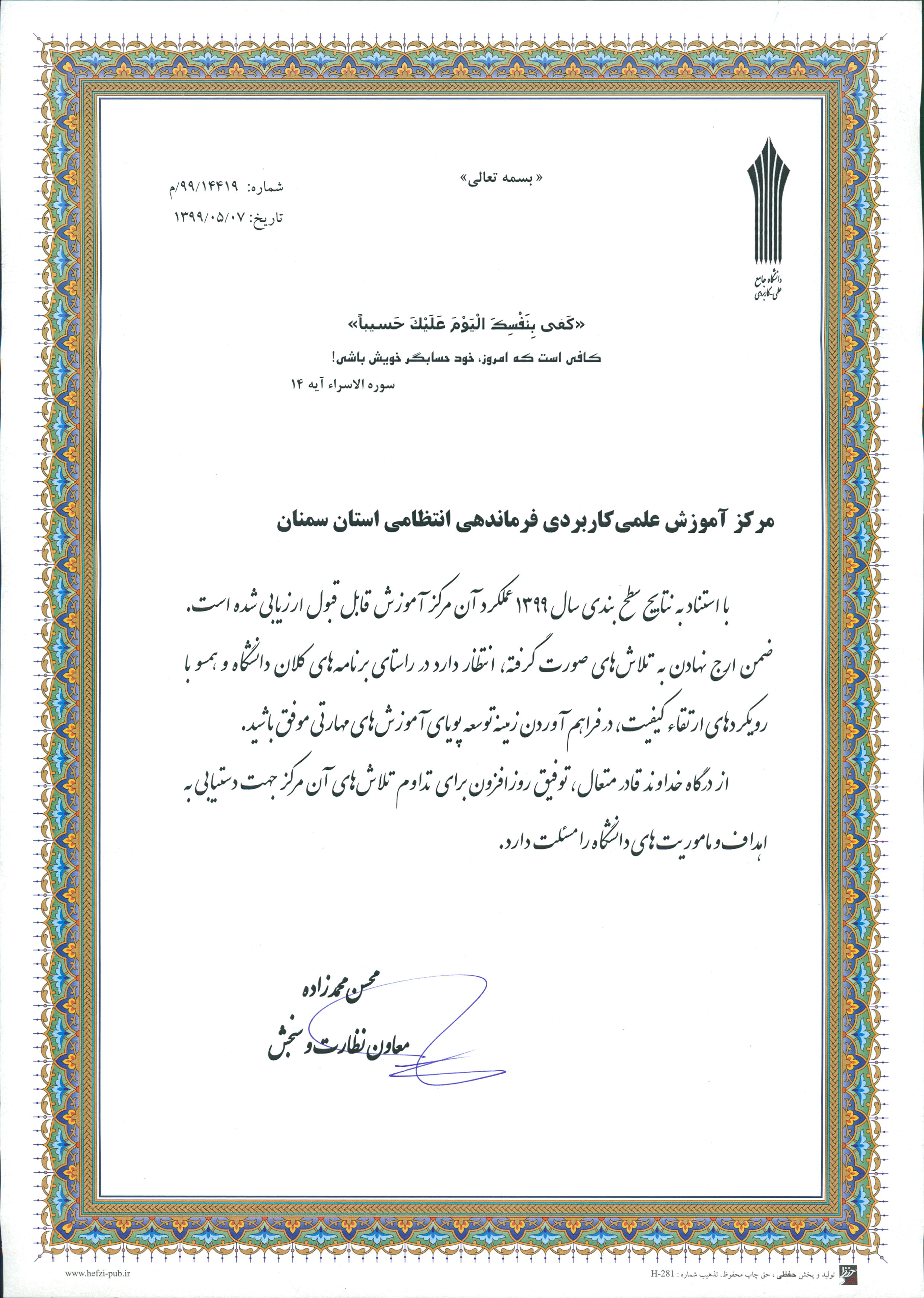 مرکز علمی کاربردی نیروی انتظامی استان سمنان در سطح بندی سال 99 به عنوان مرکز قابل تقدیر شناخته شد و توسط دانشگاه مورد تشویق قرار گرفت.