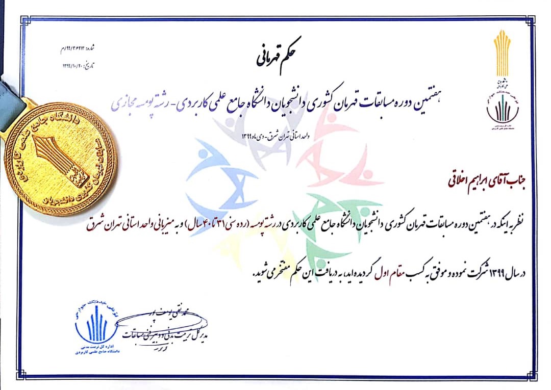 کسب مقام اول در هفتمین دوره مسابقات قهرمان کشوری دانشجویان دانشگاه جامع علمی کاربردی-رشته پومسه مجازی توسط آقای ابراهیم اخلاقی