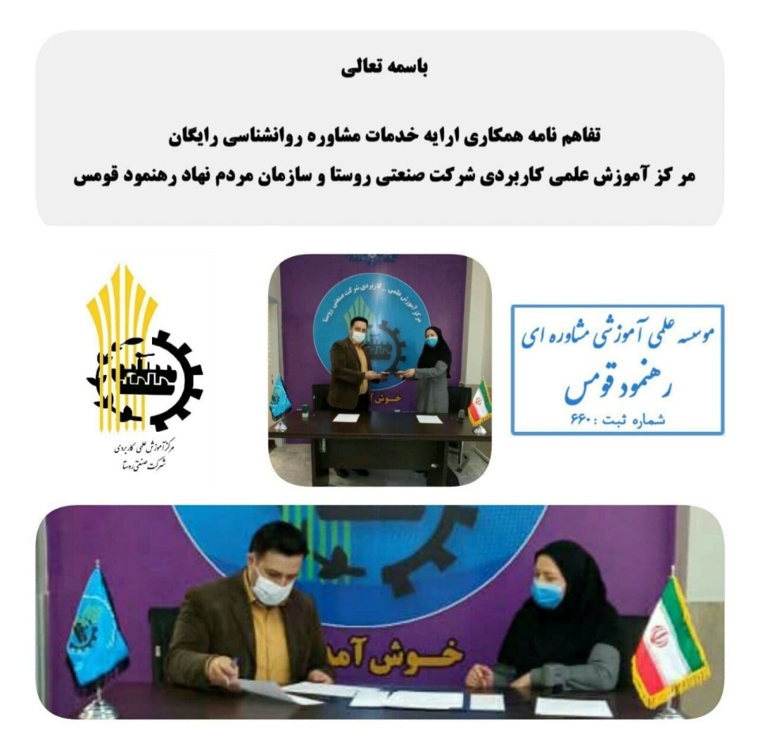 به گزارش روابط عمومی مرکز آموزش علمی کاربردی شرکت صنعتی روستا، به مناسبت میلاد با سعادت حضرت فاطمه (س)، طلیعه فجر انقلاب و همچنین به منظور ارتقای سلامت روان دانشجویان مراکز سطح استان سمنان، مرکز آموزش علمی کاربردی شرکت صنعتی روستا با همکاری سازمان مردم نهاد رهنمود قومس (با مجوز رسمی ارائه مشاوره روانشناسی) و تحت نظارت دانشگاه جامع علمی کاربردی واحد استان سمنان، تفاهم نامه ارائه خدمات رایگان مشاوره روانشناسی به مدت یکسال را منعقد نموده است.