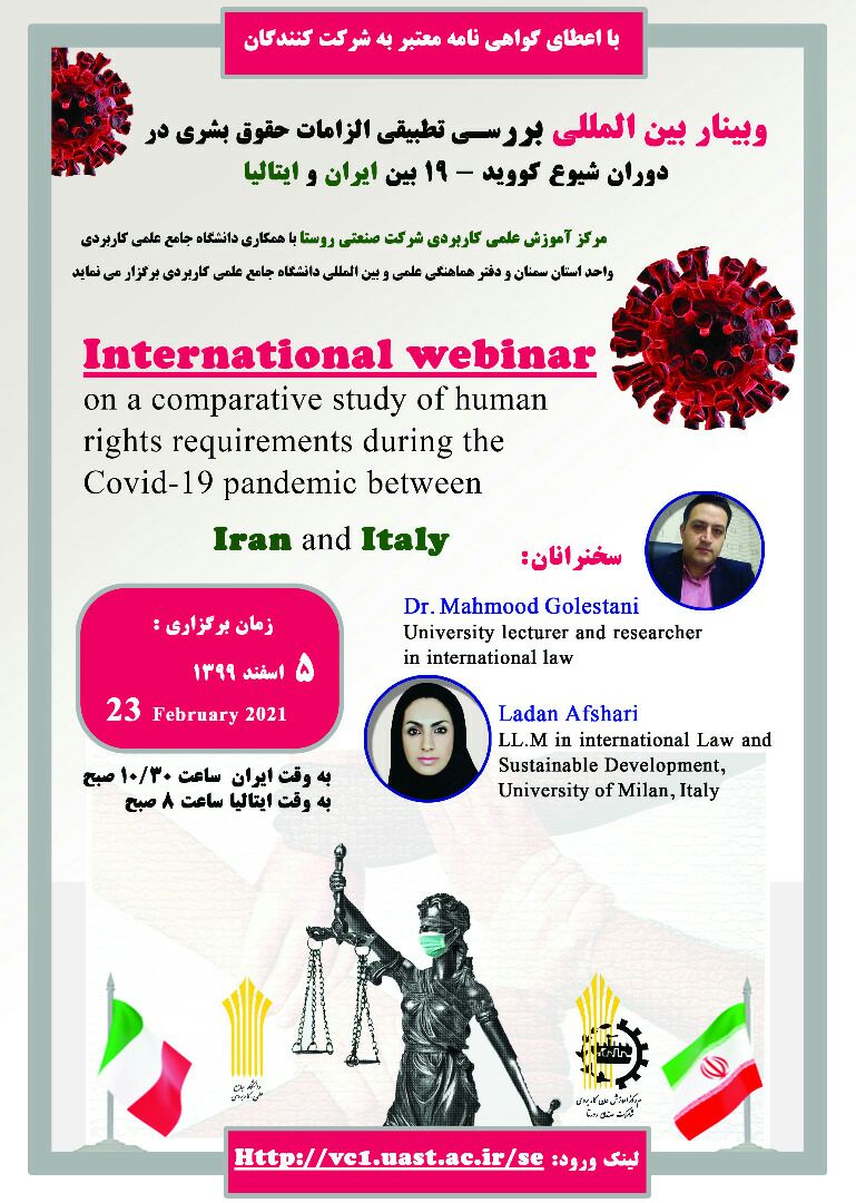 مرکز آموزش علمی کاربردی شرکت صنعتی روستا با همکاری دانشگاه جامع علمی کاربردی واحد استان سمنان و دفتر همکاری علمی و بین المللی دانشگاه جامع علمی کاربردی برای اولین بار در سطح استان سمنان اقدام به برگزاری وبینار بین المللی با موضوع «بررسی تطبیقی الزامات حقوق بشری در دوران شیوع کووید _ ۱۹ بین ایران و ایتالیا می نماید.
