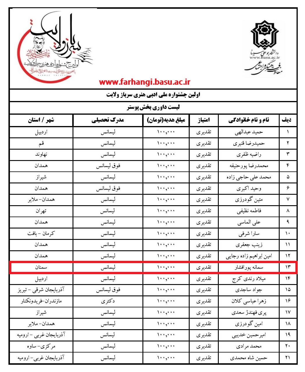 در اولین جشنواره ادبی و هنری سرباز ولایت، از بین 68 اثر ارسالی، سرکار خانم سمانه پورافشار مسئول فرهنگی دانشجویی مرکز -آموزش علمی کاربردی شرکت صنعتی روستا حائز رتبه برتر شدند.