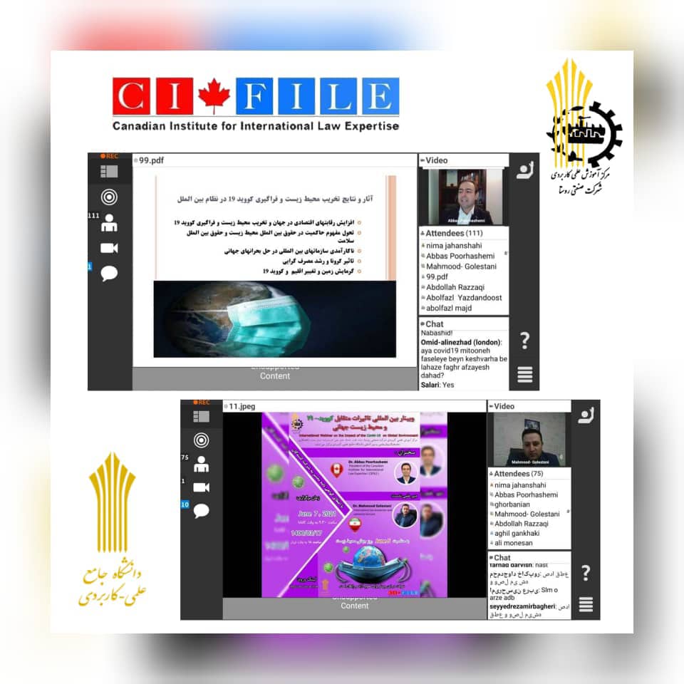 به گزارش روابط عمومی مرکز به مناسبت 5 June روز جهانی محیط زیست "وبینار بین المللی تاثیرات متقابل کووید- ۱۹ و محیط زیست جهانی" از سوی مرکز آموزش علمی کاربردی شرکت صنعتی روستا با همکاری دفتر همکاریهای علمی و بین المللی دانشگاه جامع علمی کاربردی و موسسه تخصصی حقوق بین الملل کانادا (CIFILE) با استقبال بی نظیر بیش از 120 نفر برگزار شد. در این وبینار، ابتدا دکتر قربانیان، ریاست محترم دانشگاه جامع علمی کاربردی استان سمنان ضمن حمایت از تشکیل نشست های علمی مجازی از مرکز آموزش علمی کاربردی شرکت صنعتی روستا تقدیر نمودند. سپس دکتر گلستانی،سرپرست مرکز آموزش علمی کاربردی شرکت صنعتی روستا خدمت به اقشار مختلف مردم جهت اعتلاء دانش و آگاهی را از رسالت های اجتماعی قلمداد نمودند. در ادامه این وبینار دکتر پورهاشمی سخنران اصلی وبینار به تشریح اهمیت حفاظت از محیط زیست در دوران کرونا پرداخت و گفت: باید تلاش شود تا تغییر رفتار در حوزه حفاظت از محیط زیست را در افراد جامعه به ویژه در دوران کووید-19 نهادینه نماییم.