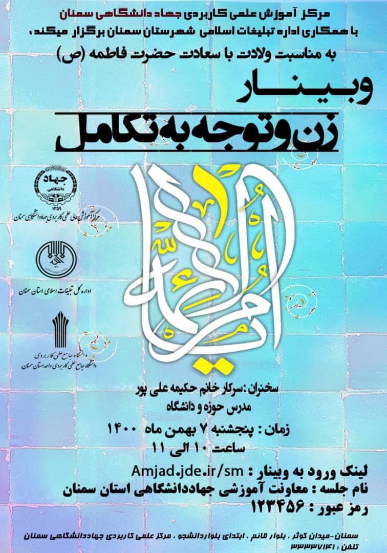 برگزاری وبینار زن و توجه به تکامل توسط مرکز آموزش علمی کاربردی جهاد دانشگاهی سمنان ۰۵ بهمن ۱۴۰۰ | ۱۴:۱۱ کد : ۵۹۲۷۰ اخبار ارسال به دیگران نام شما ایمیل شما ایمیل دریافتکننده ارسال انصراف تعداد بازدید:۱۲۳۸ مرکز آموزش علمی کاربردی جهاد دانشگاهی سمنان با همکاری اداره تبلیغات اسلامی شهرستان سمنان به مناسبت ولادت با سعادت حضرت فاطمه (ص) برگزار می کند.