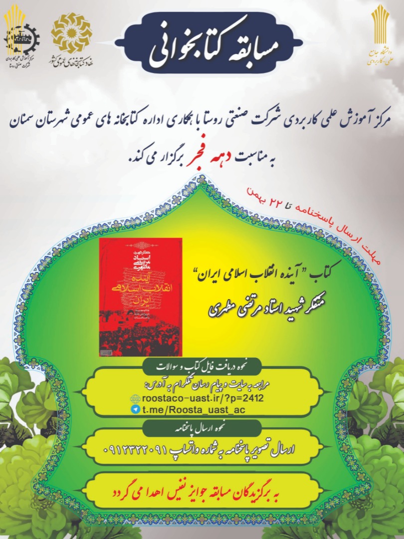 به مناسبت دهه فجر، مرکز آموزش علمی کاربردی شرکت صنعتی روستا با همکاری اداره کتابخانه های عمومی شهرستان سمنان برگزار میکند.
