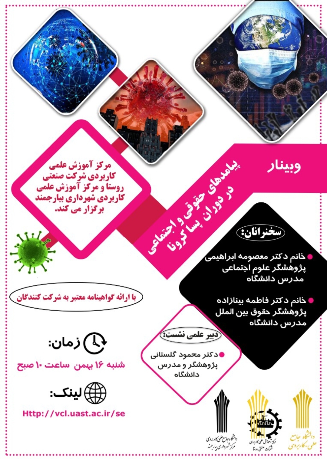 وبینار پیامدهای حقوقی و اجتماعی در دوران پسا کرونا، توسط مرکز آموزش علمی کاربردی شهرداری بیارجمند و مرکز آموزش علمی کاربردی شرکت صنعتی روستا ۱۴ بهمن ۱۴۰۰ | ۱۲:۵۵ کد : ۵۹۴۳۴ اخبار ارسال به دیگران نام شما ایمیل شما ایمیل دریافتکننده ارسال انصراف تعداد بازدید:۱۳۳۹