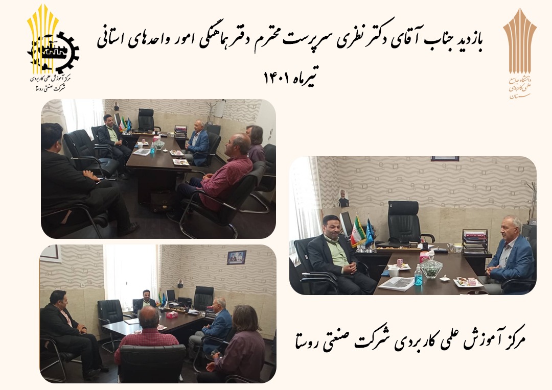 به گزارش روابط عمومی دانشگاه جامع علمی کاربردی استان سمنان، بازدید جناب آقای دکتر نظری، سرپرست محترم دفتر هماهنگی امور واحدهای استانی دانشگاه جامع علمی کاربردی از مرکز آموزش علمی کاربردی شرکت صنعتی روستا با حضور دکتر سعید محمدیان سمنانی، سرپرست محترم دانشگاه جامع علمی کاربردی واحد استان سمنان و دکتر محمود گلستانی، رئیس مرکز آموزش علمی کاربردی شرکت صنعتی روستا در روز دوشنبه مورخ 13 تیر ماه 1401 صورت پذیرفت.